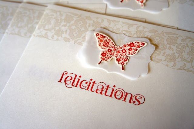 Ici, papier à lettre Stampin' Up! auquel j'ai ajouté une petite touche personnelle: Papier vélin cartonné perforé avec la perforatrice Étiquette décorative, et papillon étampé et perforé avec la perforatrice Éphémère.